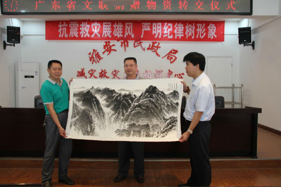 许敏谦秘书长还介绍说,4月28日,广东省文学艺术界联合会、广东电视台、羊城晚报社、广东省慈善总会、广东省繁荣粤剧基金会、广州市振兴粤剧基金会联合主办《情牵四川、心系雅安---广东文艺界大型赈灾义演》,义演现场,前中共广东省委常委、省委书记吴南生,广东省书法家协会名誉主席陈永正,广东省书法家协会主席张桂光捐赠了自己精心创作的墨宝,广东省文联主席刘斯奋带头捐赠了画作,广东省美术家协会主席许钦松以及潘嘉俊、陈永锵、李劲堃等十几位著名画家均捐出自己珍爱的画作,中国摄协副主席、广东省摄协主席李伟坤特意从珠海赶到广州参加捐赠活动,在国际上屡获大奖的摄影家谢墨也献上摄影作品《黑天使》。这批名作共62件,全部转赠雅安市慈善总会用于慈善拍卖筹集赈灾善款。