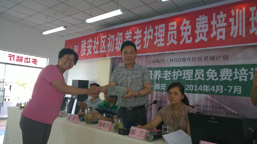 7月4日,由雅安市民政局主办、中国扶贫基金会、英特尔(中国)有限公司、加多宝集团资助,鹤童老人护理职业培训学校承办的“公益同行—NGO合作社区发展计划—雅安社区初级养老护理员免费培训班”结业仪式,在雅安市名山区社会福利服务中心举行。雅安市民政局局长、市老龄委副主任雷健、中国扶贫基金会灾后重建办副主任陈济沧、雅安市老龄办常务副主任、市慈善总会秘书长韩峰伟、雅安市人力资源和社会保障局职业技能鉴定中心主任郝兰、鹤童老年公益基金会副秘书长刘国亮、鹤童学校高级教师、天津中医药大学护理学院教授王燕等出席结业仪式。结业仪式上,为157名通过职业技能考核的学员颁发了国家人力资源和社会保障部《初级养老护理员职业资格证书》。