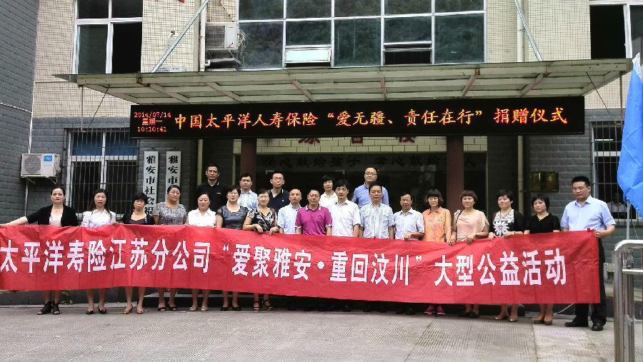 7月14日上午,中国太平洋寿险江苏分公司“爱无疆、责任再行”捐赠仪式在雅安市社会福利院举行,捐赠仪式上,江苏分公司领导向雅安市社会福利院捐赠20余万元,雅安市民政局局长雷健出席并致答谢词。仪式结束后,江苏分公司领导还参观了市儿童福利院和市社会福利院.