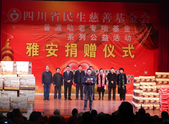 11月27日下午,四川省民生慈善基金会普渡助老专项基金系列公益活动捐赠仪式在雨城区举行。仪式上,四川省民生慈善基金会领导、爱心企业代表向参加仪式的雨城区20名老人代表发放了蚕丝被、大米和养生杯,向6所敬老院捐赠了12台多功能治疗仪。