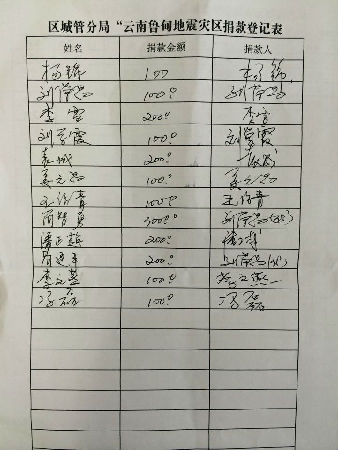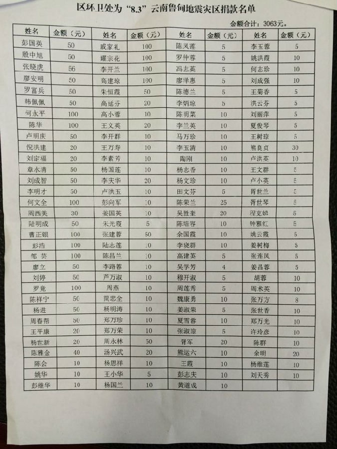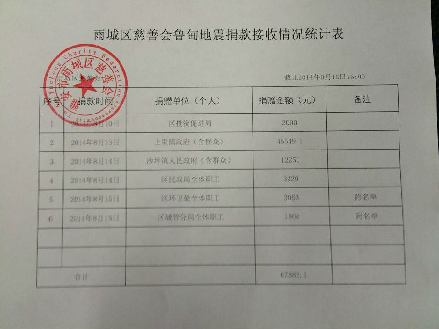 截止8月15日16时雨城区慈善会累计接收向云南鲁甸地震捐款共计67882.10元,名单如下: