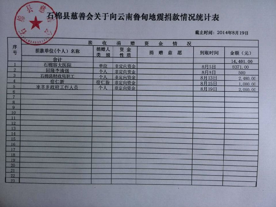 截止8月19日16时石棉县慈善会累计接收向云南鲁甸地震捐款共计14401.00元,名单如下: